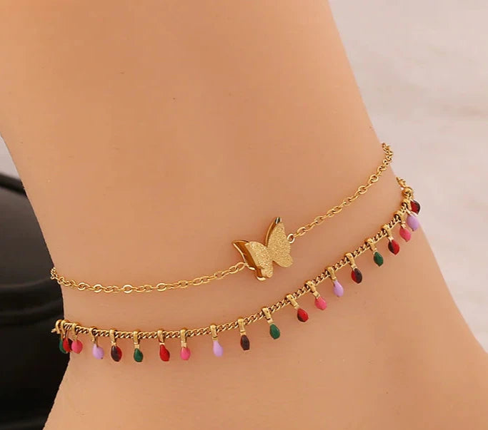 Cavigliera in acciaio inox con pendenti smaltati e farfallina